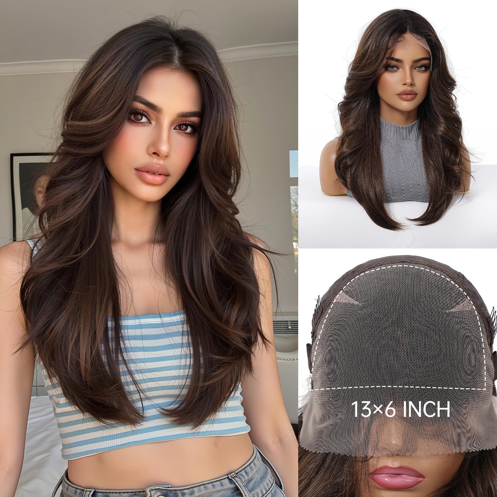 Introducing the DWY Tilly 13x6 Lace Front Free Part Medium-Length Wavy Wig, a perfect blend of elegance and versatility. This stunning wig features a captivating combination of brown and black hues with dark roots, creating a natural and dimensional look. The 13x6 lace front design allows for a free parting option, giving you the flexibility to style as you desire while ensuring a seamless hairline.